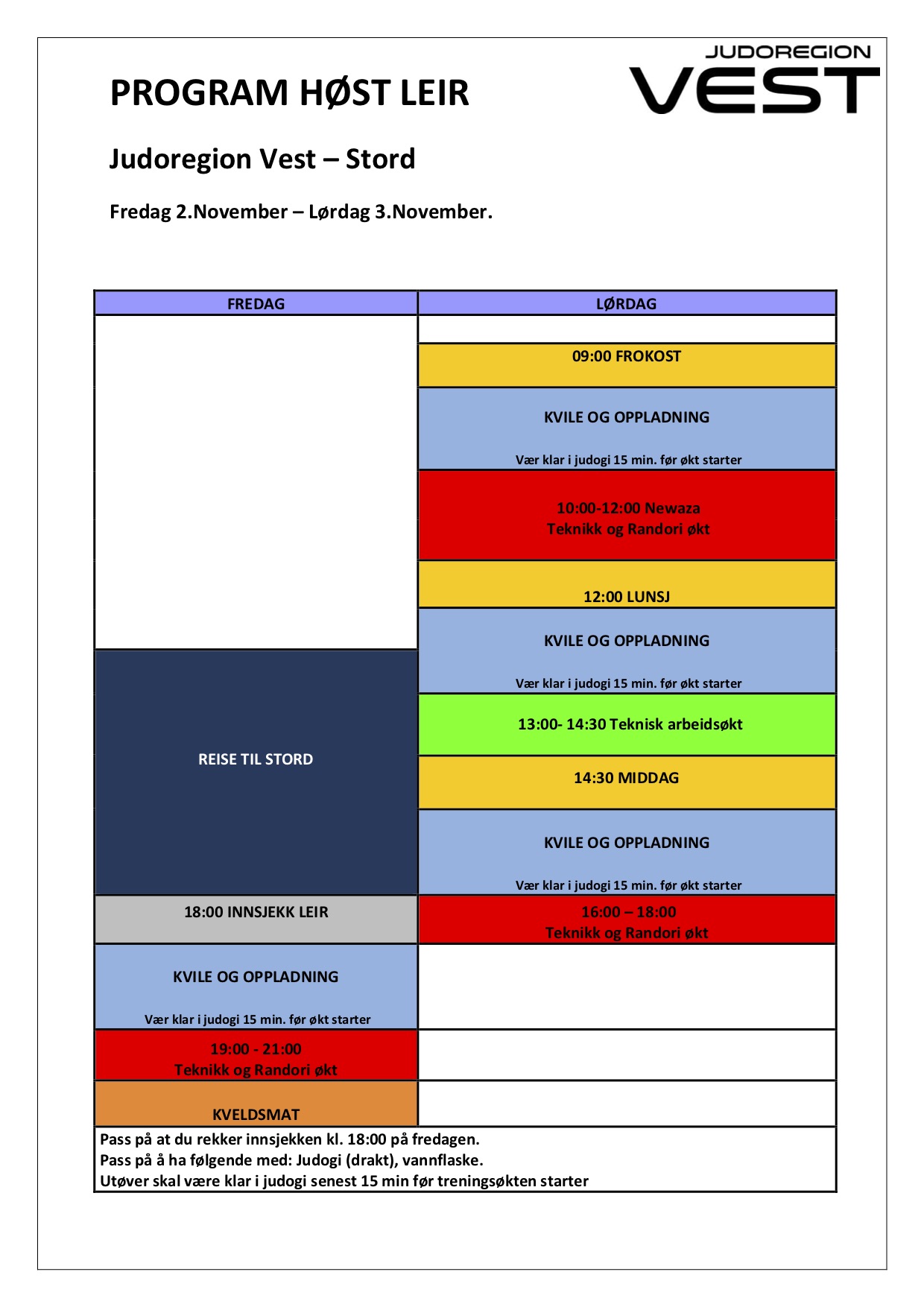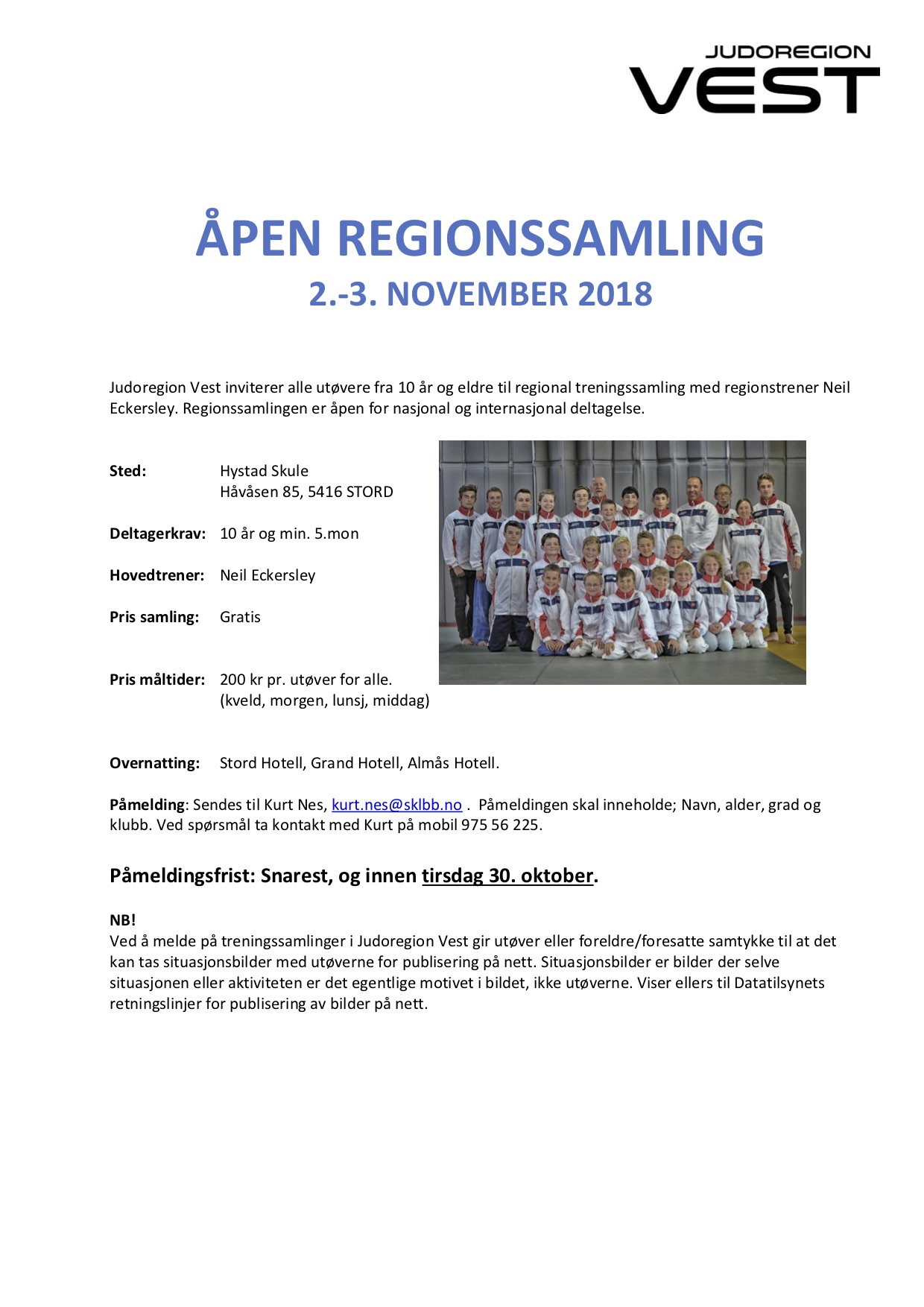 Regionssamling 2. - 3. november | Judoregion Vest inviterer alle utøvere fra 10 år og eldre til regional treningssamling med regionstrener NeilEckersley. Regionssamlingen er åpen for nasjonal og internasjonal deltagelse. | | | | Innsjekk klokken 18:00 den 2. November før vi starter en Teknikk og Randori økt klokken 1900, kveldsmat på fredagen servers klokken 21. Frokost serveres klokken 0900 og vi avslutter klokken 1800 på lørdag den 3. november. Se programmet og detaljer i bildene. | | | | | | | |